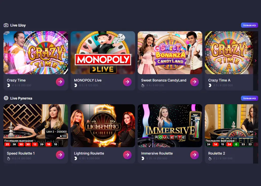 Это формат, который максимально приближен к реальному казино. Здесь вас обслуживают настоящие дилеры, и вы можете общаться с ними и другими игроками в режиме реального времени. Минимальные ставки в живых играх часто выше, чем в обычных игровых автоматах, но в некоторых казино вы найдете столы с низкими лимитами. Например, можно сыграть в живую рулетку или блэкджек, начиная с 10-20 грн за раунд.